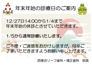 2025/12/19 2025年は12月27日(土)14時までの診療となります。 2026年は1月5日より診療をおこないます。 2025年12月27日14時から2026年1月4日まで休診となります。 ご理解のほど、よろしくお願い申し上げます。